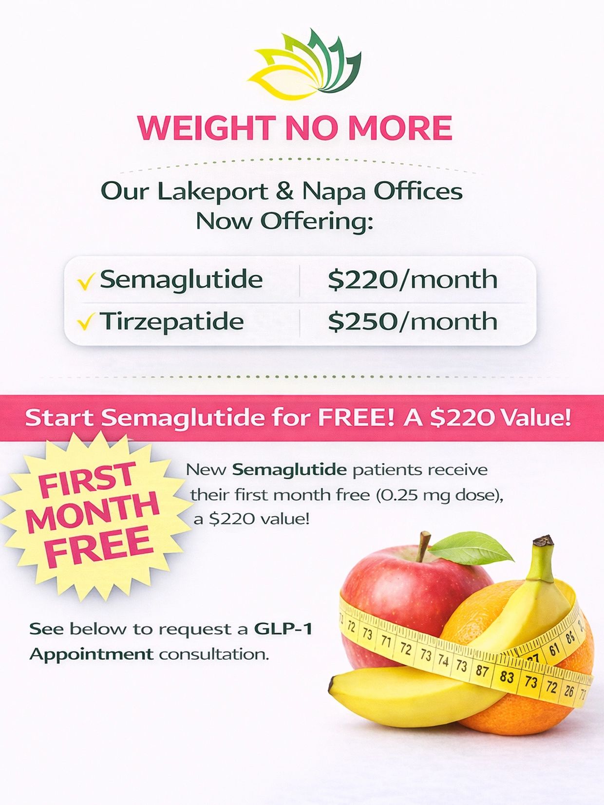 Visit us at Weight No More Napa, where we offer GLP1 medications like semaglutide and tirzepatide to support your weight loss journey. Our weight loss center is open Wednesday from 11:00 am to 5:30 pm.*