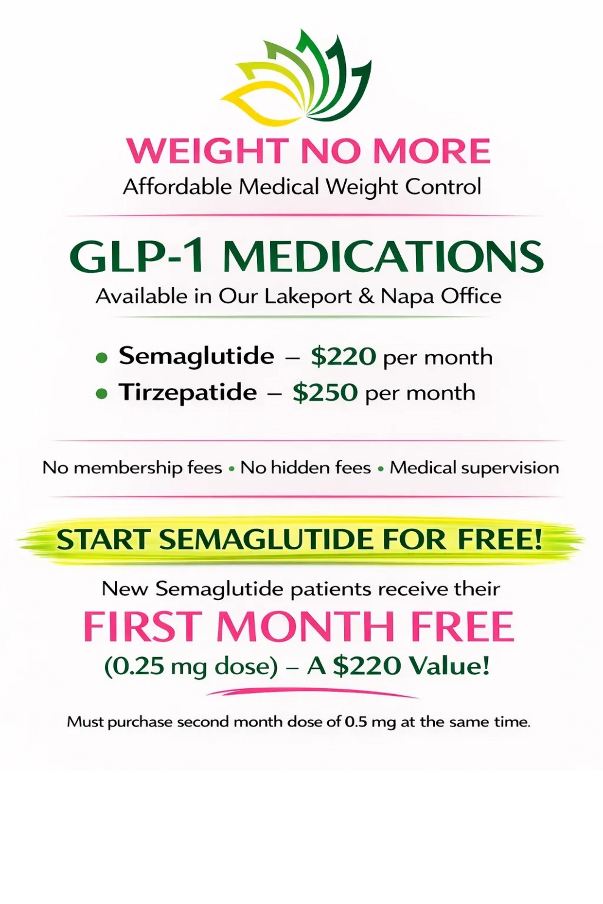 Visit our weight loss center open Thursday from 11 am to 5 pm*, where you can learn about GLP-1 medications like semaglutide and tirzepatide. At Weight No More Lakeport and Weight No More Napa, we focus on effective weight management solutions, including those available in Weight No More Ukiah, CA.